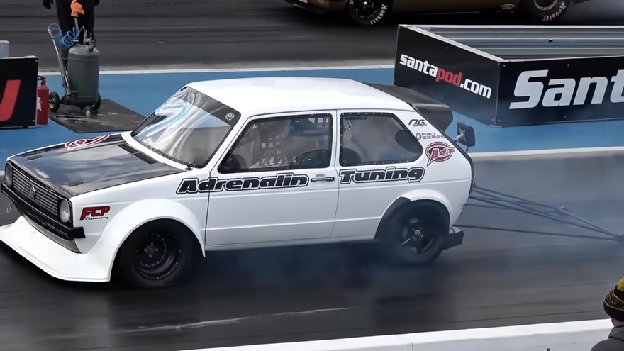 Rekordi püstitanud Volkswagen. | foto: Kuvatõmmis /YoutubeSaksa firma Adrenalin Tuning poolt ehitatud esirattaveoline Volkswagen Golf suutis Inglismaal Santa Podis korraldatud kiirendusvõistlusel veerandmiili läbida 8,254 sekundiga.