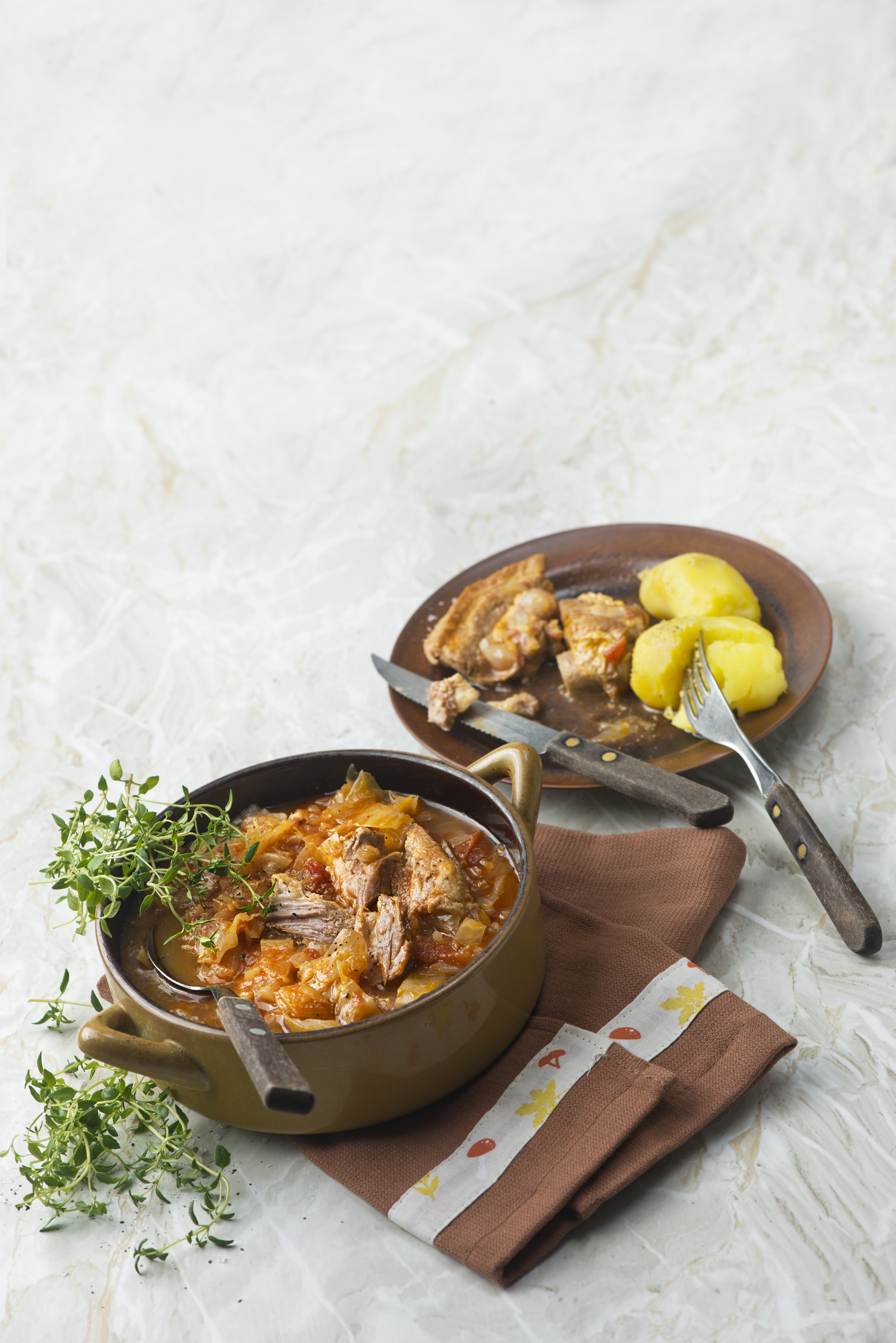 Lisa pool kapsast ning puista peale 1 tl tüümiani. Tõsta ribid kapsale, seejärel pane peale ülejäänud kapsas ja tüümian. Lisa vesi ning maitse järgi soola, pipart ja suhkrut. Lase keema tõusta. Alanda kuumust, kata pott kaanega ja hauta madalal kuumusel 2 tundi, kuni liha on hästi pehme ja lööb kontide küljest lahti. Võta ribid välja. Sega juurde sidrunimahl ning maitsesta veel soola, pipra ja suhkruga.