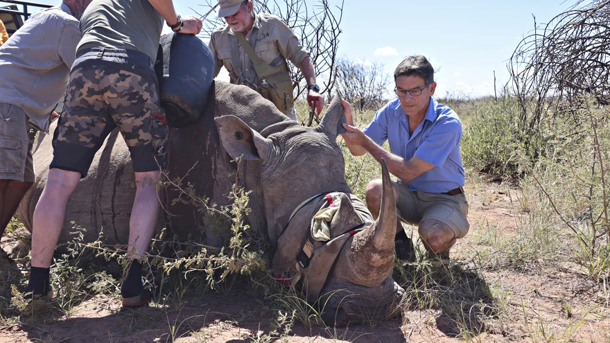 Ninasarvikuid on pikka aega salaküttimise eest kaitstud sarvede ära saagimisega. Wikelski ja tema kolleegid jälgivad ninasarvikuid reaalajas, et näha, kuhu loomad liiguvad ja kas nad on terved. | foto: MAX PLANCK INSTITUTE OF ANIMAL BEHAVIOURRaadiosaatja kiili seljal või kitse kõrvas – ja satelliitjälgimine algab. Oma elukeskkonnast andmeid koguvad loomad võivad toimida Maa sensoorse süsteemina, usub professor Martin Wikelski.