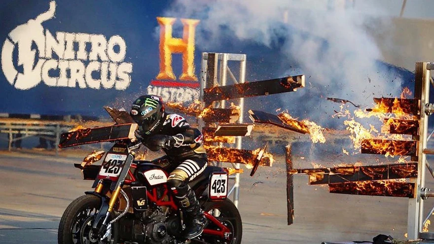 Rekordi püstitamine. | foto: Nitro CircusAmeeriklanna Vicki Golden püstitas uue maailmarekordi: nimelt kihutas ta mootorrattaga läbi 13 põleva takistuse.