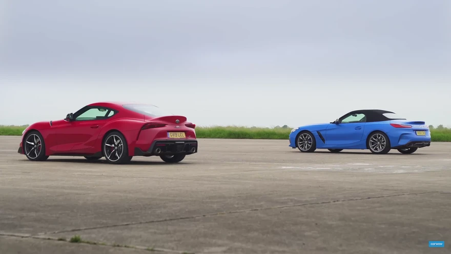 Toyota Supra vs BMW Z4. | foto: Kuvatõmmis /YoutubeYoutube kanal Carwow korraldas võidusõidu, kus mõõtu võtsid kaks poolvenda: Toyota Supra ja BMW Z4 M40i.