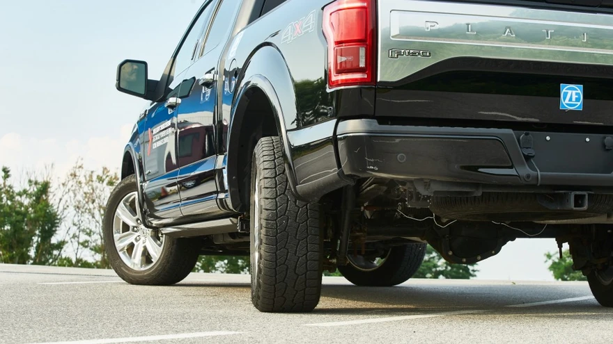 Nelikroolimisega varustatud Ford F-150. | foto: Kuvatõmmis /YoutubeSaksa firma ZF insenerid konstrueerisid süsteemi, mis võimaldab ka pikapite tagarattad panna pöörama.